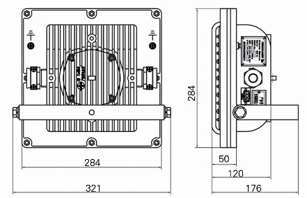 該燈具為固定使用型,采用塵密型兼隔爆結構。主要由接線腔、電源腔、光源防護腔組成。220V交流電源通過引入裝置,接入接線腔,再通過鑲嵌導電柱接入電源板。電源板將220V交流變換成穩(wěn)壓、恒流、直流電源通過接線柱接入LED光源。光源防護腔由高亮度LED發(fā)光二極管、散熱板透明罩、透明罩壓圈等構成。 該燈具配有可調(diào)安裝架和4個M8的安裝螺孔,方便用戶安裝燈具和調(diào)整照明方向、角度。